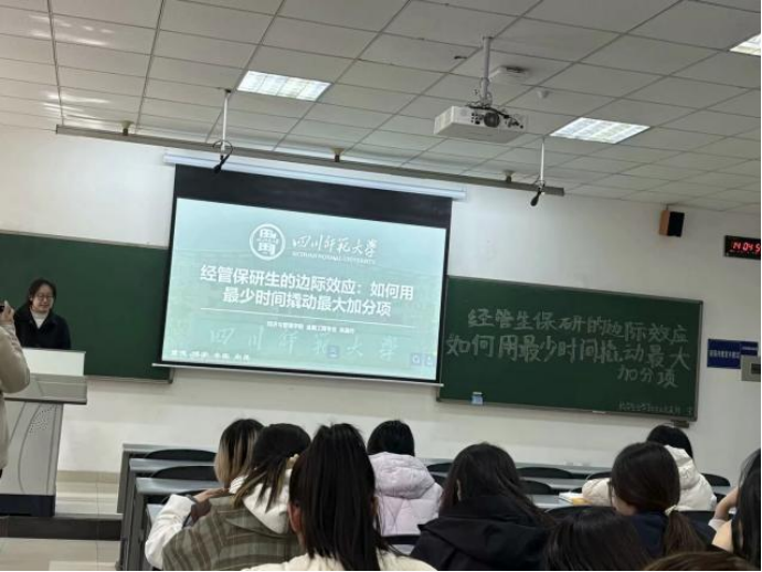 2025年3月26日,经管学院在第一教学楼A201举办朋辈经验分享会,邀请已保研至西南交通大学经济管理学院的张瀚丹学姐,为2022级、2023级同学们带来了一场以“保研的边际效应”为主题的精彩分享。她围绕学习、竞赛、科研与综合素质提升等关键环节,细致讲解了如何以有限的精力实现个人履历的“最优配置”。